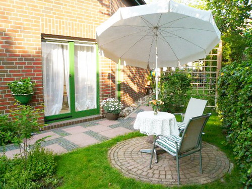 Vom Eßplatz am Fenster geht der Blick in den Garten. An schönen Tagen lockt hier die Terrasse mit Gartenmöbeln und Sonnenschirm. Hier darf auch geraucht werden.